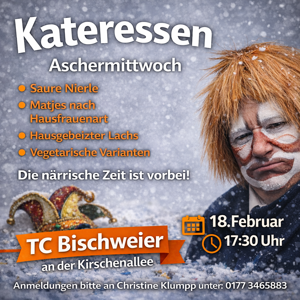 Am Aschermittwoch, 18. Februar, heißt es ab 17:30 Uhr im Clubhaus des TC Bischweier wieder: Zeit für das Kateressen. Über viele Jahre hinweg haben Roland und Gustl diese Veranstaltung mit ihrer Leidenschaft, ihren Ideen und ihrer Kochkunst maßgeblich geprägt und zu einem festen Bestandteil des Vereinslebens gemacht. An diese lange Erfolgsgeschichte knüpft nun ein neues Küchenteam an, das die liebgewonnene Tradition bewahren und zugleich mit neuen kulinarischen Akzenten weiterführen möchte.